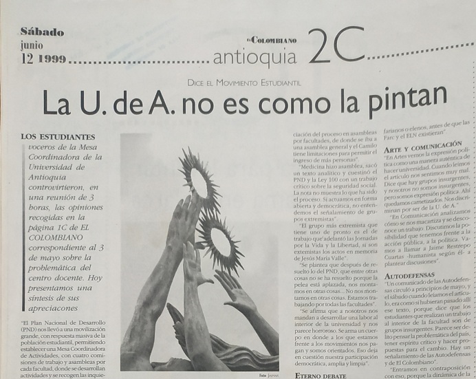 El 12 de junio de 1999 el periódico El Colombiano publicó un artículo titulado “La U. de A. no es como la pintan”. Según la publicación, las ideas recogidas en este texto fueron resultado de una reunión de tres horas, en la que un grupo de estudiantes cuestionó un artículo de ese mismo medio, publicado el 3 de mayo de 1999, en el que, a juicio de los universitarios, El Colombiano estigmatizaba la institución y a quienes hacían parte de ella. “Cuando leímos el artículo nos sentimos muy mal […]. Nos discriminan por ser de la U de A […]. Parece ser delito pensar la problemática del país, tener espíritu crítico y hacer propuestas para el cambio”, dicen algunos apartados de la respuesta.