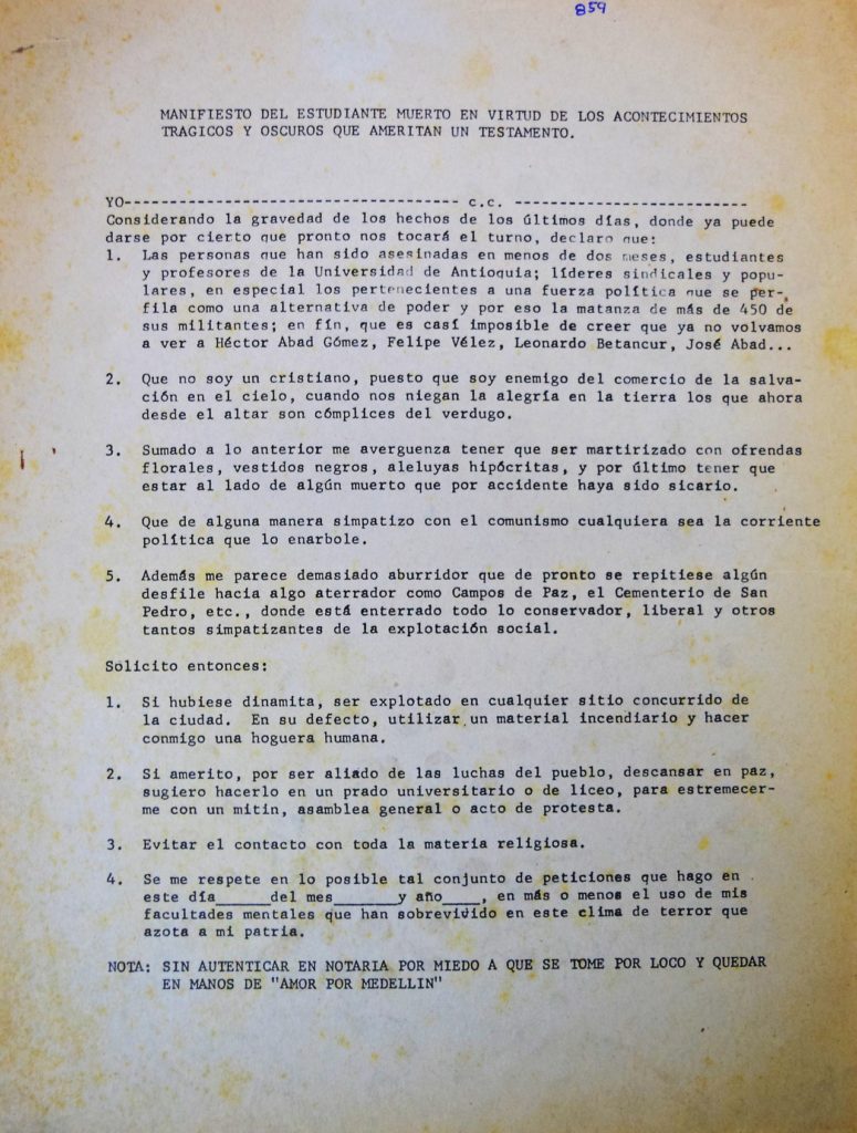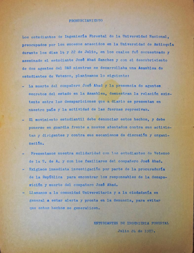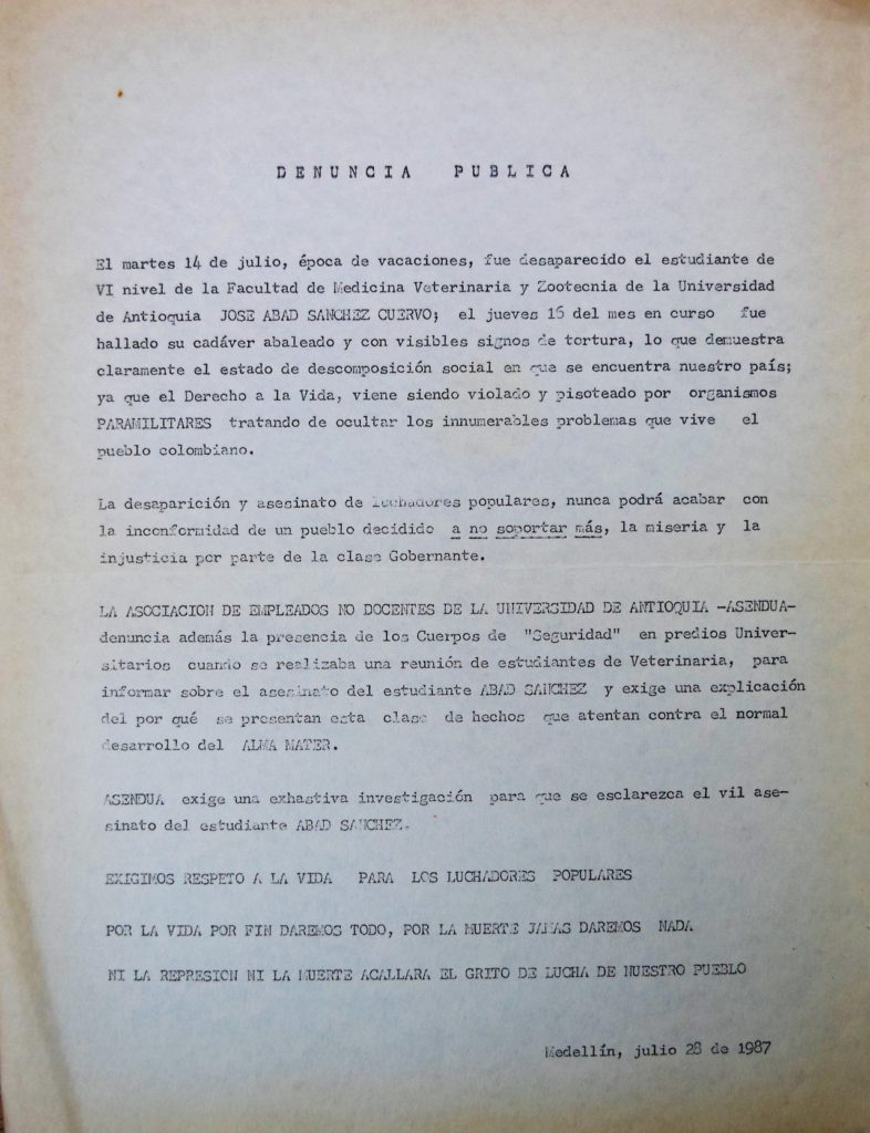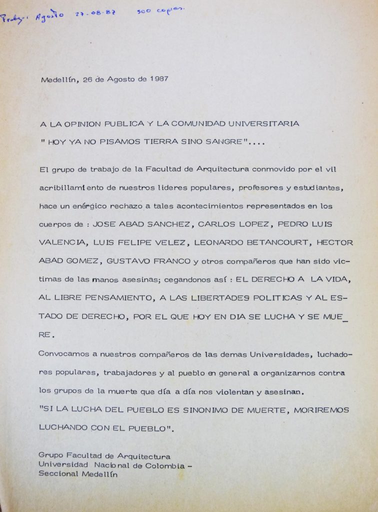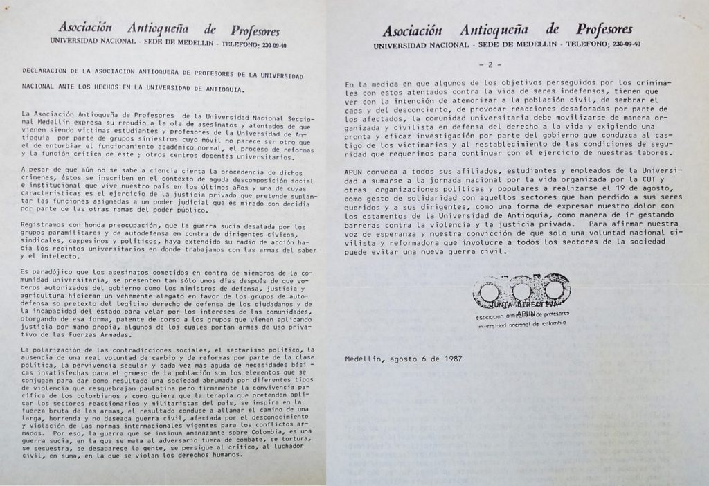 “Decretar, a partir de la fecha, tres días de duelo como forma de expresar su sentimiento por la muerte de los estudiantes y el profesor asesinado”, se lee en el primer artículo de la resolución 610 del 4 de agosto de 1987 del Consejo Superior Universitario (CSU) de la Universidad de Antioquia. Esos tres días de duelo representaron la primera acción simbólica de origen oficial para rechazar una serie de homicidios que, se entendería después, hacían parte de una estrategia de violencia política contra estudiantes, docentes y líderes sociales.