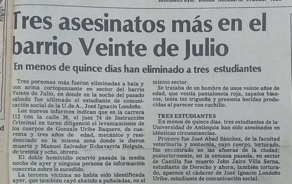 A esa primera lista le faltaban aún dos nombres. Uno era el del estudiante de Comunicación Social Periodismo José Ignacio Londoño. Tres hombres se lo llevaron del barrio Veinte de Julio por la fuerza, en la madrugada del 2 de agosto. Su cuerpo fue hallado en la parte alta del mismo barrio. Estaba mutilado, con signos de tortura y con varios impactos de bala.