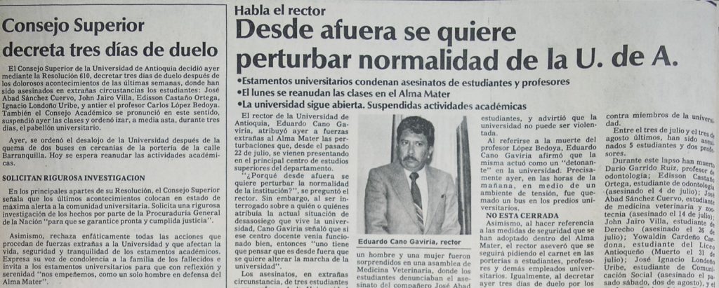 El último nombre de esa primera racha de asesinatos fue el de Carlos López Bedoya, profesor de Antropología, asesinado el 3 de agosto (un día antes del pronunciamiento del Consejo Superior), cuando departía con varios colegas en un establecimiento cercano a la Ciudad Universitaria. Además de los tres días de duelo por estos crímenes, las directivas pidieron en su resolución que la comunidad universitaria permaneciera en “máxima alerta”, y solicitaron a la Procuraduría General de la Nación garantías y agilidad en los procesos judiciales por los asesinatos.